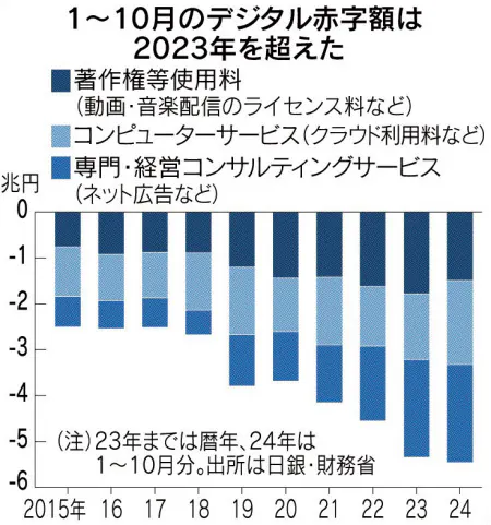 10年前の14年に2兆円だった赤字額は、23年には5.3兆円に拡大した。24年は10月時点で5.4兆円を超えた。デジタル赤字は毎月5000億円前後の水準で推移しており、通年では6兆円を突破するのが確実だ。